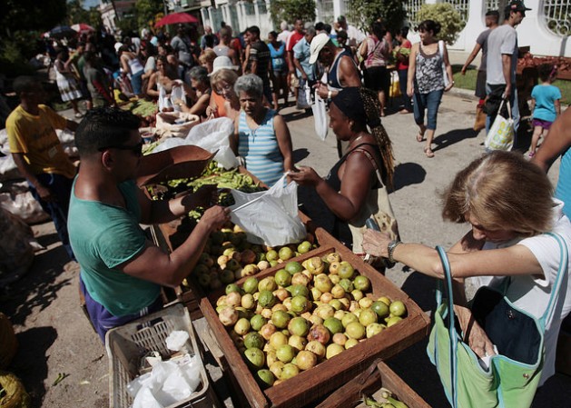 Foto: Mulheres compram alimentos em uma feira agropecuária no bairro Playa, em Havana. Sobre elas recaem mais de 98% do trabalho doméstico e o cuidado familiar não remunerado nas famílias cubanas.