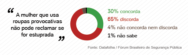 Dos entrevistados, 30% afirmaram que concordavam com a seguinte afirmação: “A mulher que usa roupas provocativas não pode reclamar se for estuprada”. O percentual foi o mesmo entre homens e mulheres.